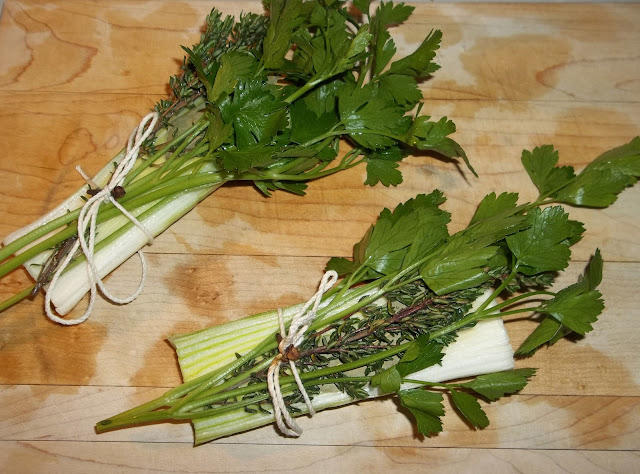 - Bouquet garni: Manojito de hierbas consistente en perejil, hojas de laurel, tomillo, rodeado de tronquitos de apio y amarrados para mentener todo el conjunto unido. El Bouquet Garni es un ramillete de hierbas y especias que se atan y se echan al fondo con intención de aportar sus fragancias. Es un atado (con un hilo, con cebollino, con verde de puerro) porque luego se saca entero y así no andan flotando sus distintos componentes por el fondo.